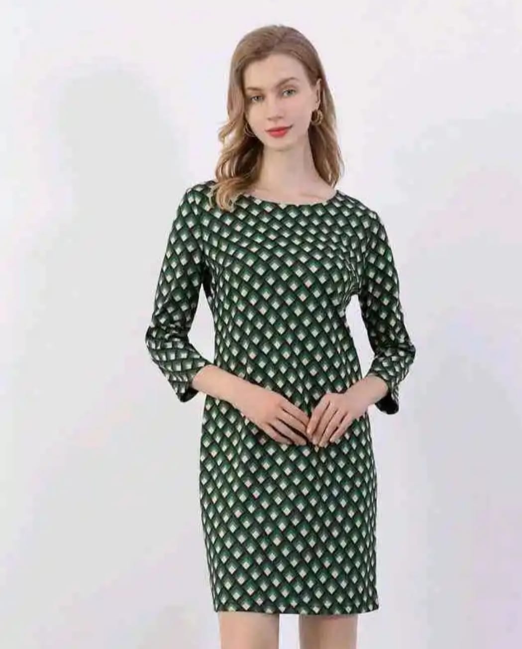 Vestido con patrón geométrico en tonos verdes y marrones que aporta un aire natural y sofisticado a cualquier look. Su diseño combina formas equilibradas que estilizan la silueta y añaden un toque moderno sin perder elegancia.